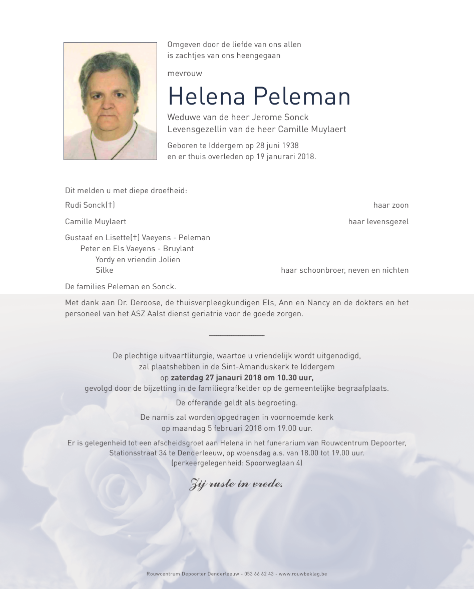 Décédée à Iddergem (9472) le vendredi 19 janvier 2018 à l'âge de 79 ans