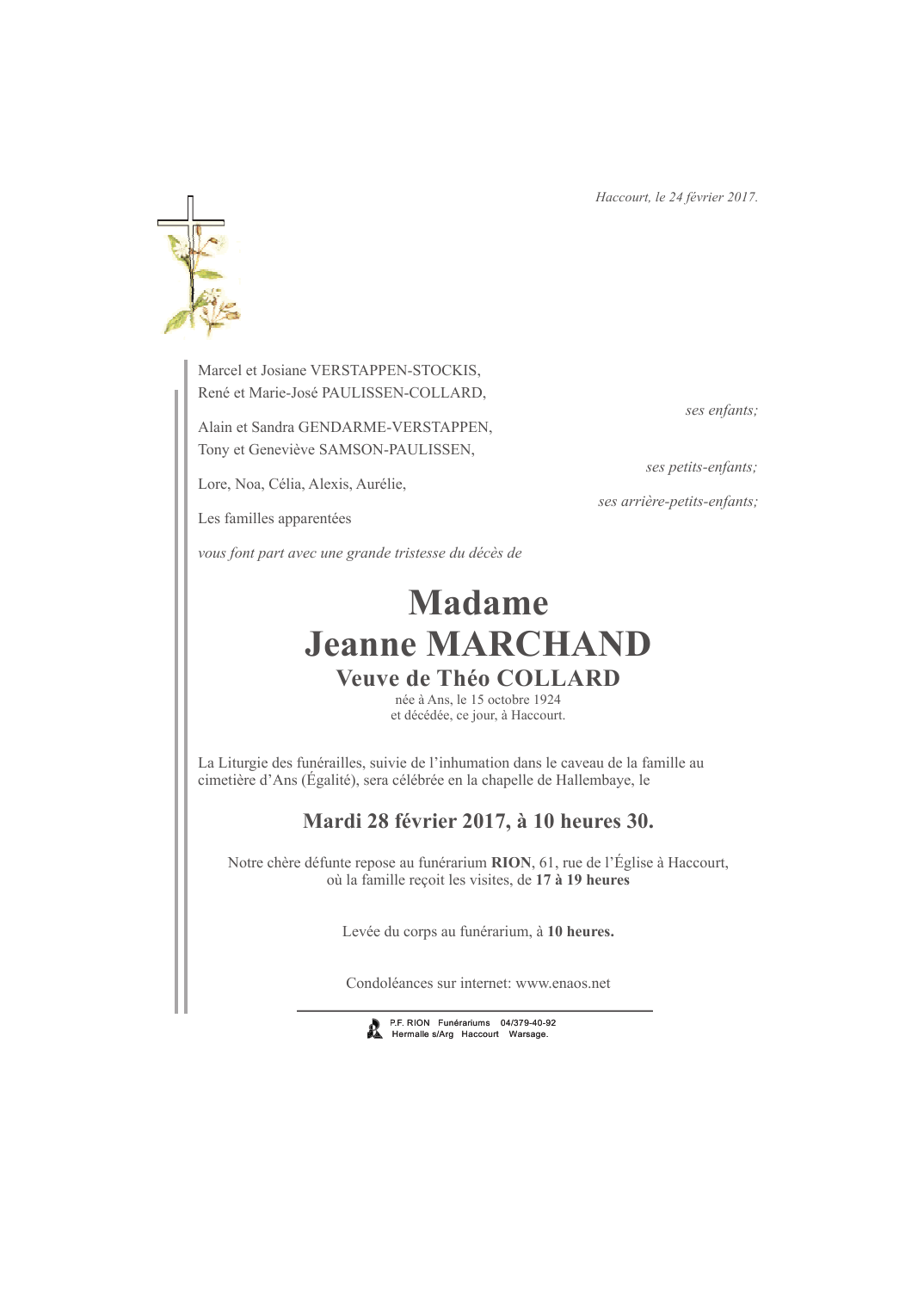 Fallecida en Haccourt (4684) el viernes, 24 de febrero de 2017 a la edad de 92 años