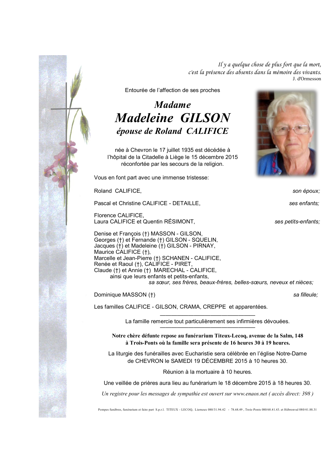 Décédée à Liège (4000) le mardi 15 décembre 2015 à l'âge de 80 ans