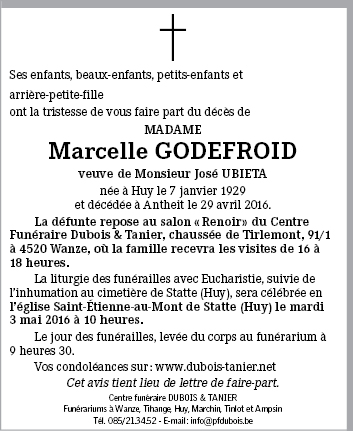 Décédée à Antheit (4520) le vendredi 29 avril 2016 à l'âge de 87 ans