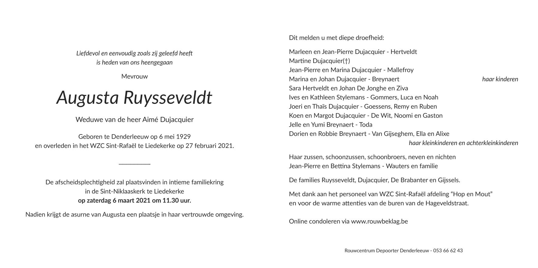 Décédée à Liedekerke (1770) le samedi 27 février 2021 à l'âge de 91 ans