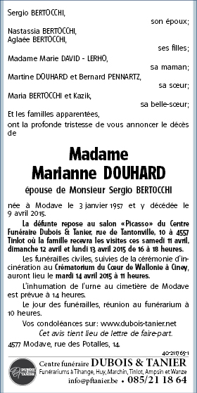Décédée à Modave (4577) le jeudi 9 avril 2015 à l'âge de 58 ans