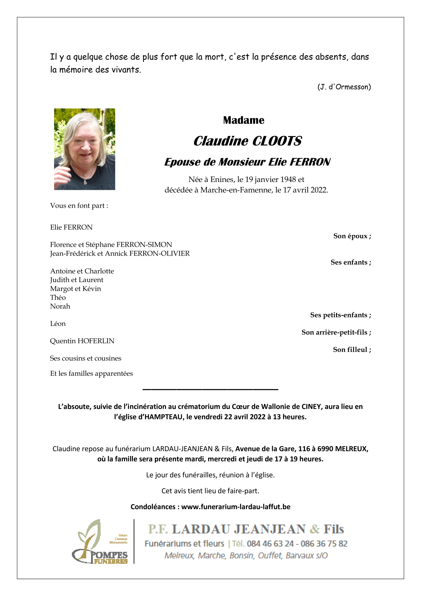Overleden te Marche-en-Famenne (6900) op zondag 17 april 2022 op 74-jarige leeftijd