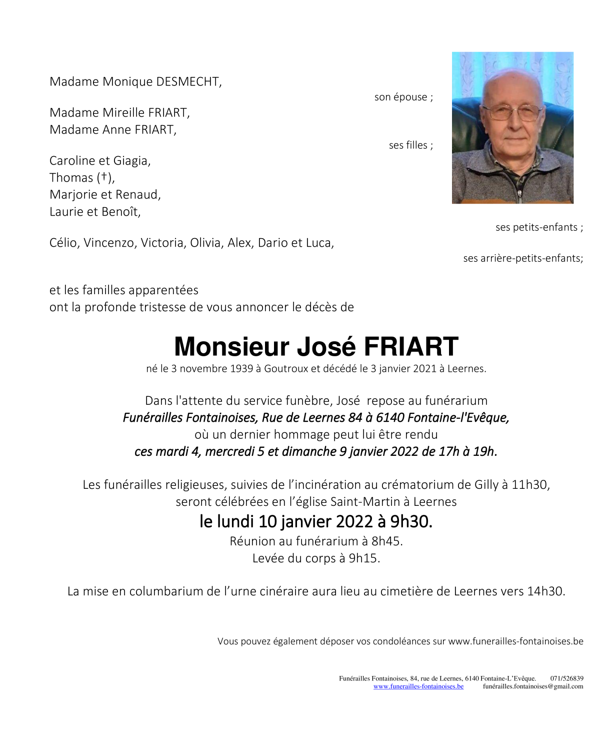 Décédé à Leernes (6142) le lundi 3 janvier 2022 à l'âge de 82 ans