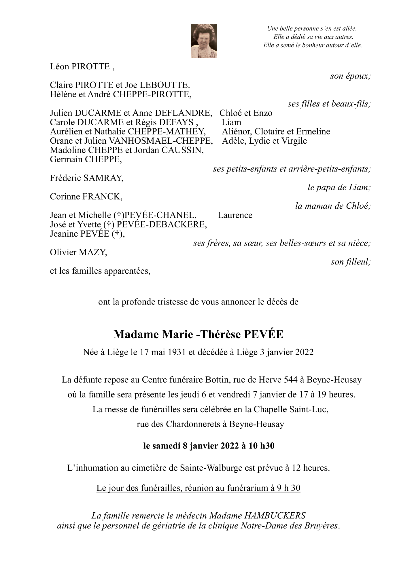 Décédée à Chênée (4032) le lundi 3 janvier 2022 à l'âge de 90 ans