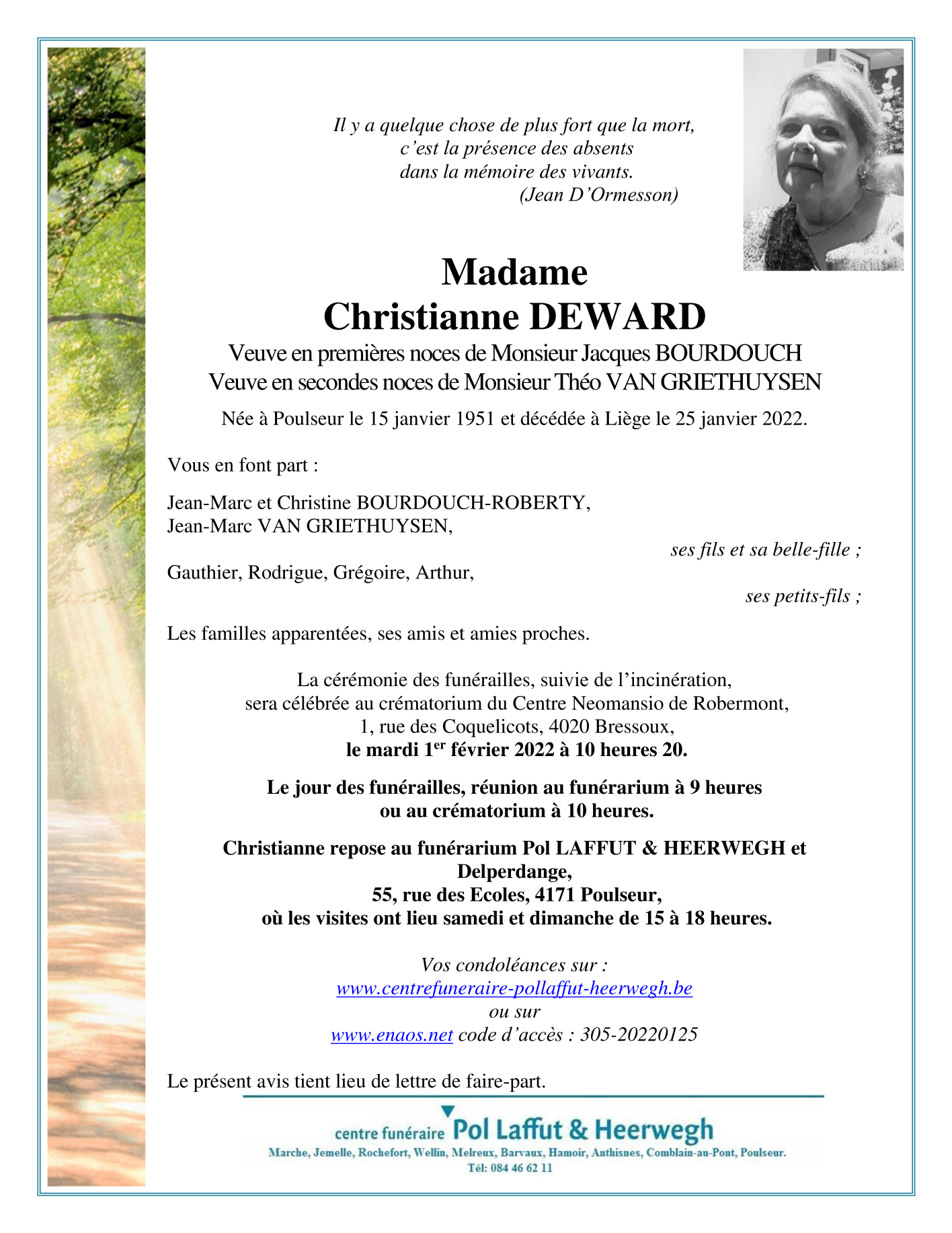 Décédée à Liège (4000) le mardi 25 janvier 2022 à l'âge de 71 ans