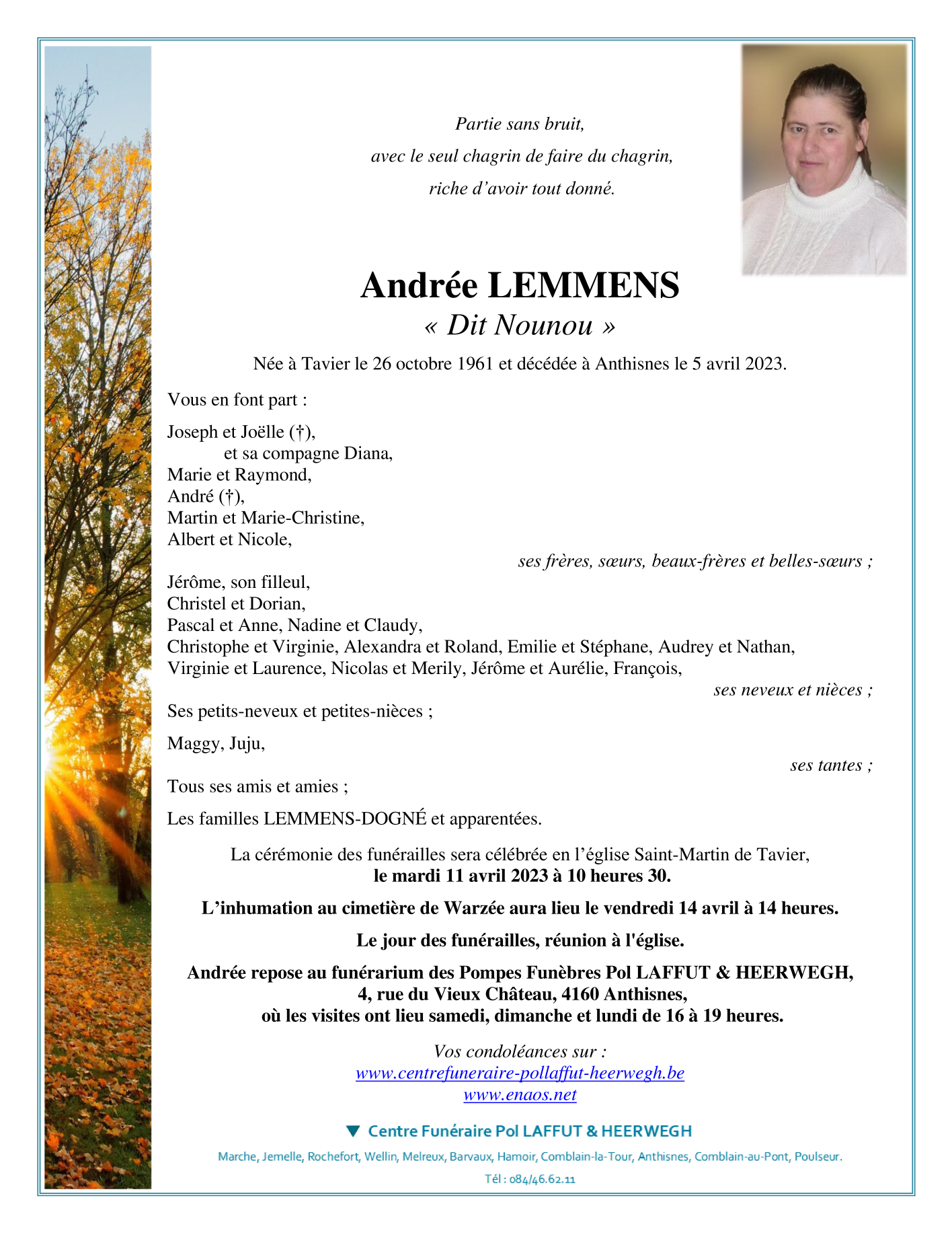 Née à Tavier (4163) le jeudi 26 octobre 1961