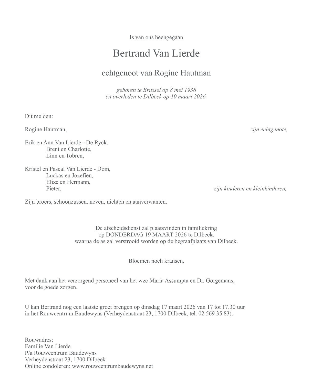 Décédé à Dilbeek (1700) le mardi 10 mars 2026 à l'âge de 87 ans