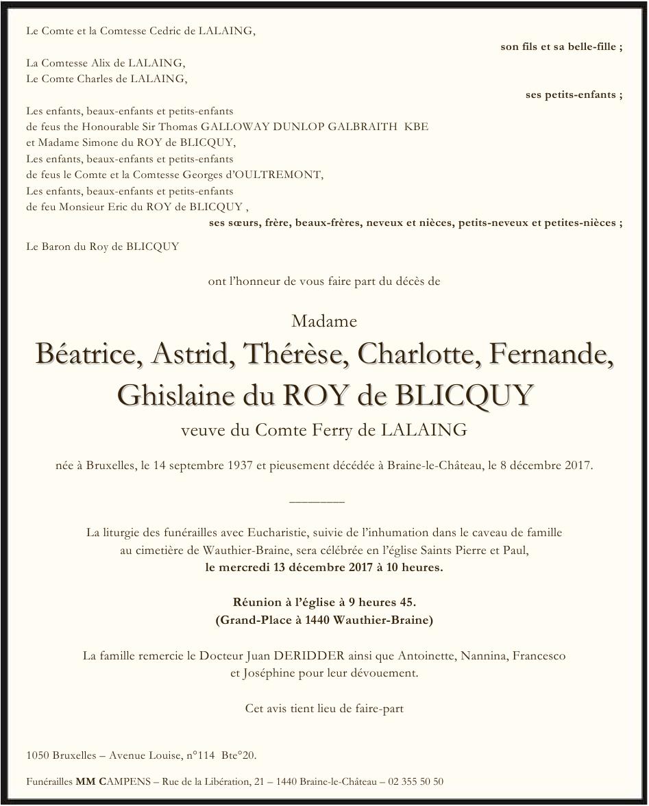 Fallecida en Wauthier-Braine (1440) el viernes, 8 de diciembre de 2017 a la edad de 80 años