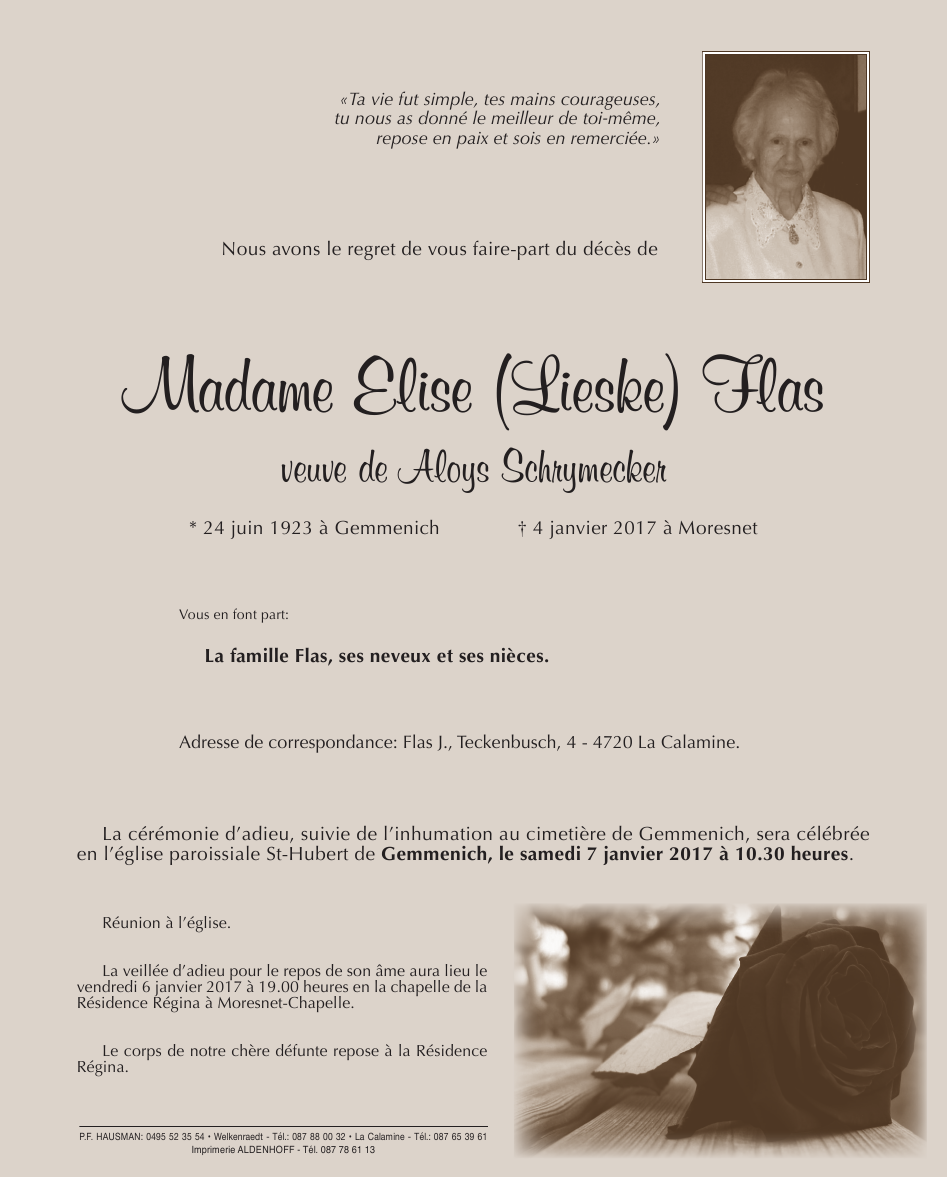 Décédée à Moresnet (4850) le mercredi 4 janvier 2017 à l'âge de 93 ans