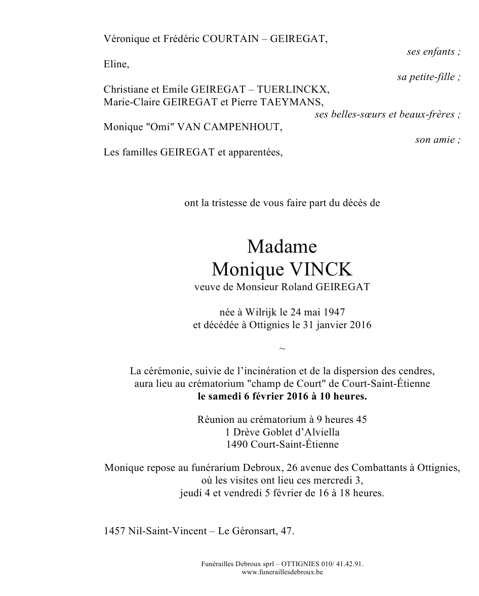 Décédée à Ottignies (1340) le mardi 2 février 2016 à l'âge de 68 ans