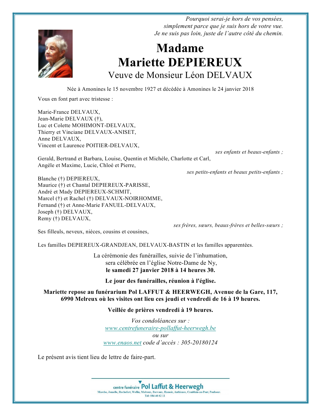 Décédée à Amonines (6997) le mercredi 24 janvier 2018 à l'âge de 90 ans