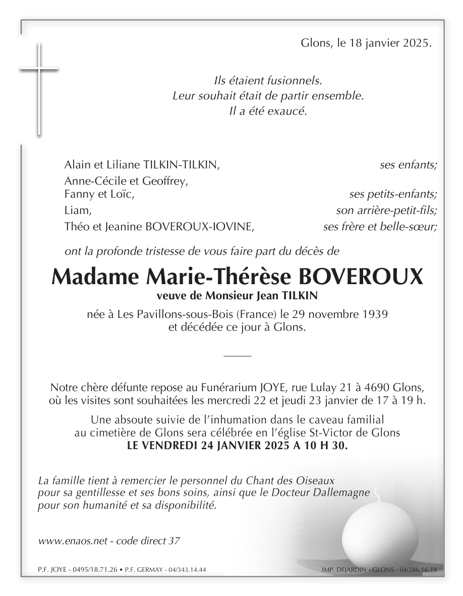 Fallecida en Glons (4690) el sábado, 18 de enero de 2025 a la edad de 85 años