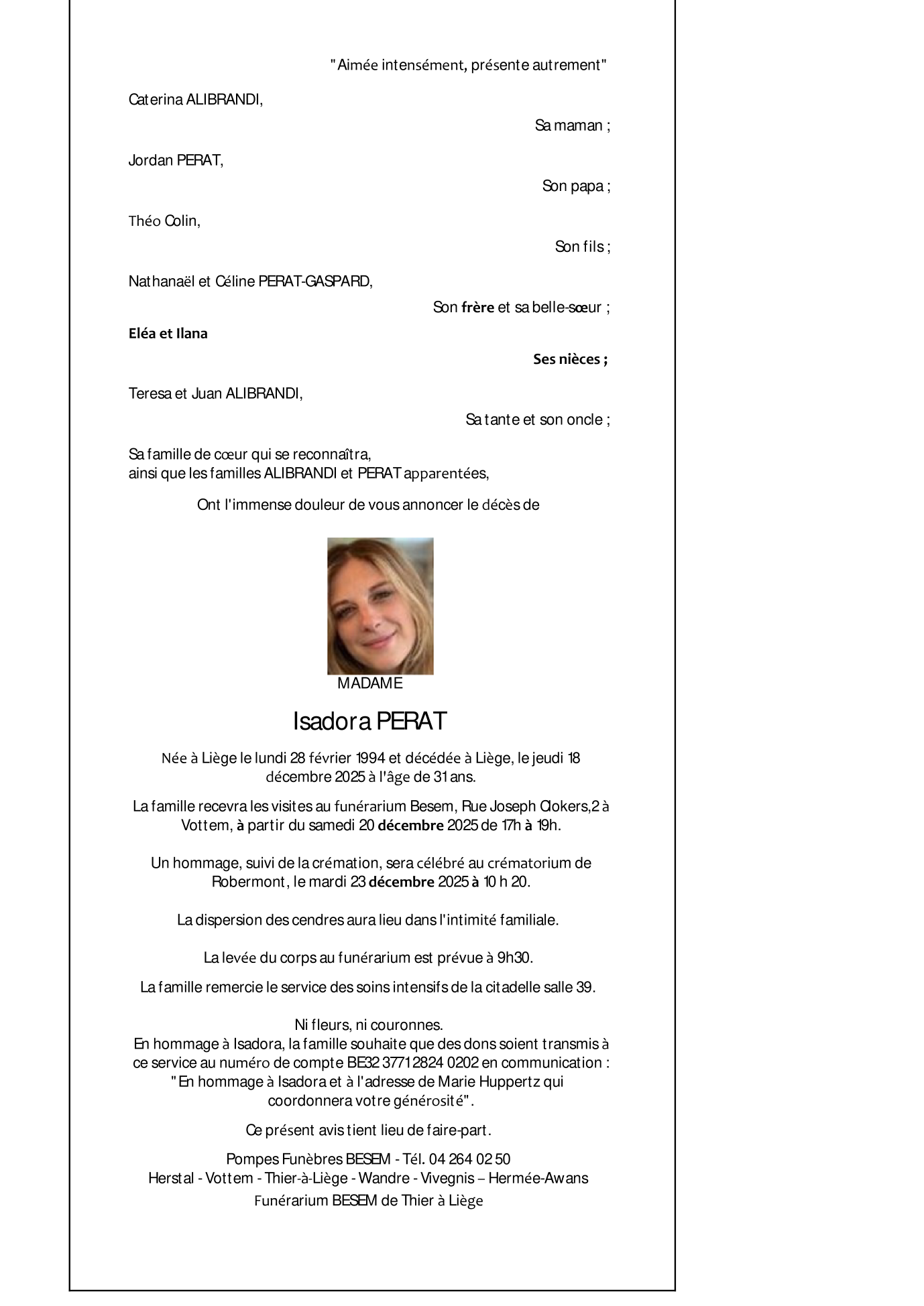 Died in Liège (4000) on 18 December 2025 at the age of 31 years