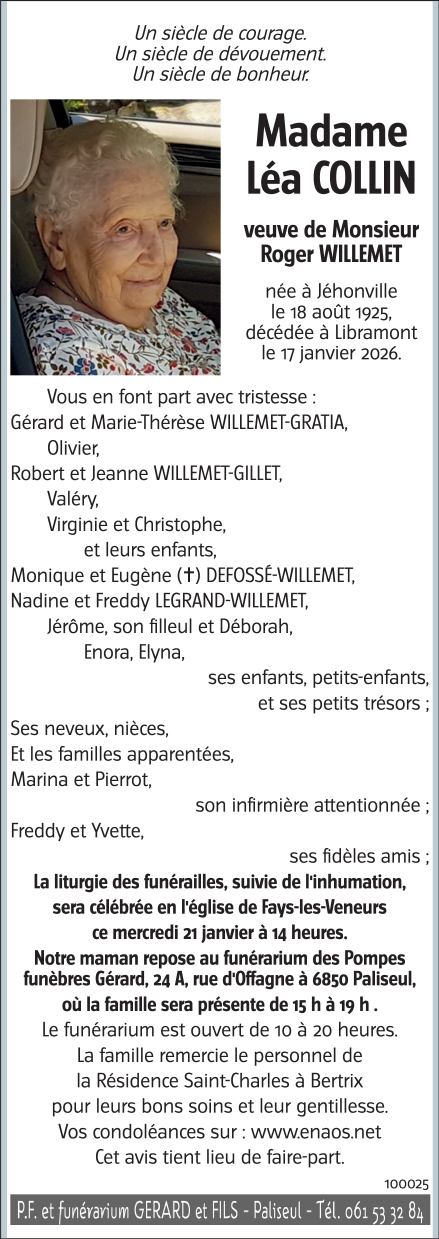 Died in Libramont (6800) on 17 January 2026 at the age of 100 years
