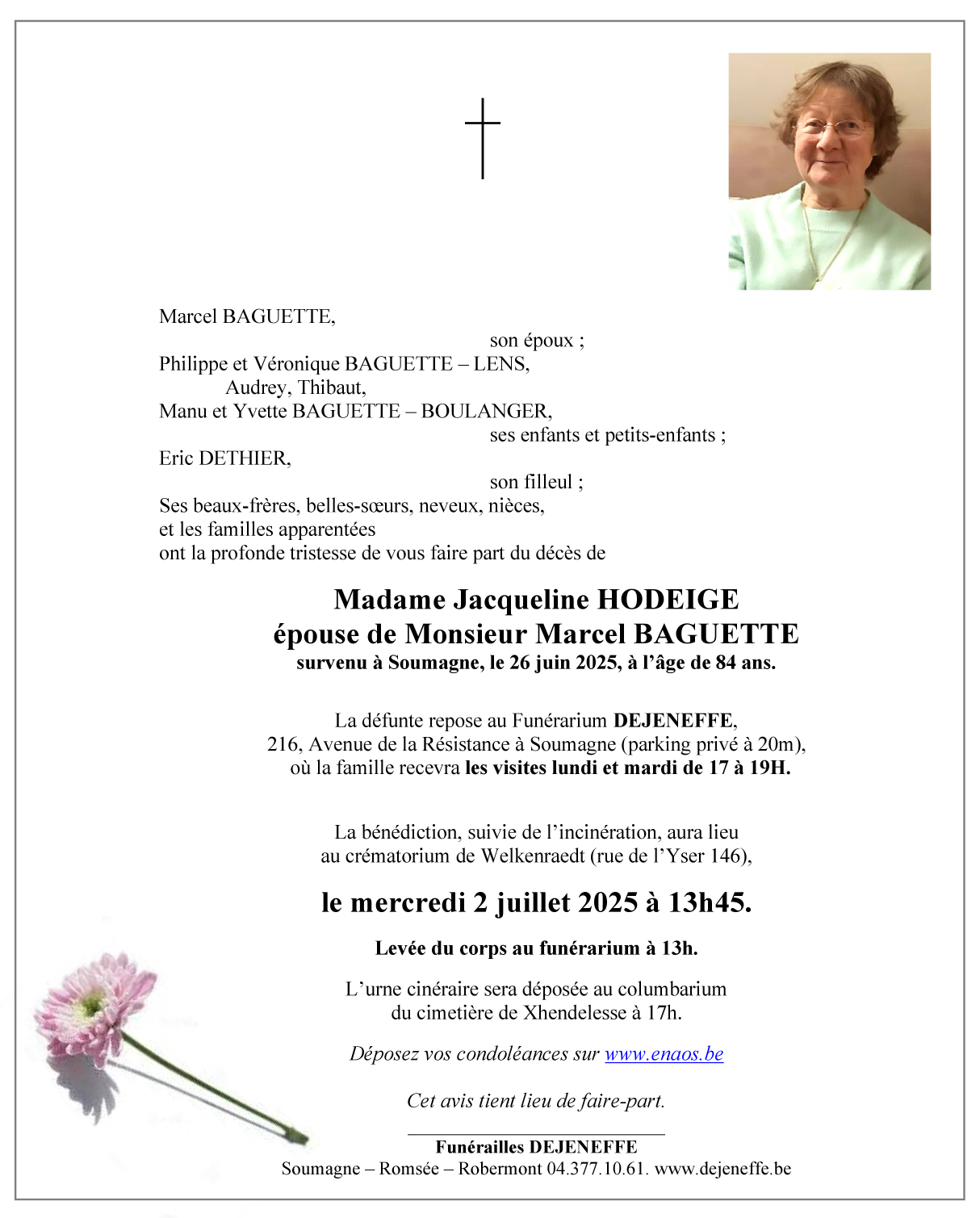 Décédée à Soumagne (4630) le jeudi 26 juin 2025 à l'âge de 84 ans