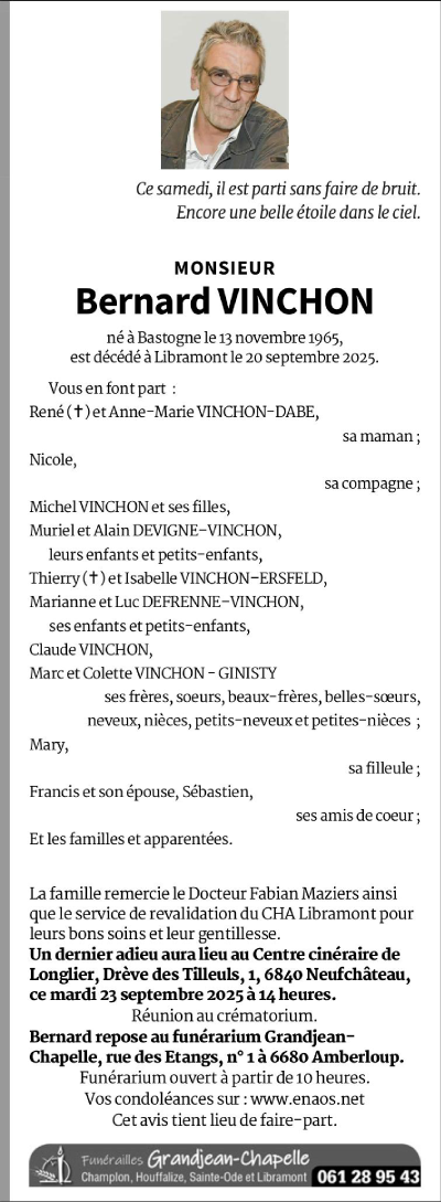 Décédé à Libramont (6800) le samedi 20 septembre 2025 à l'âge de 59 ans