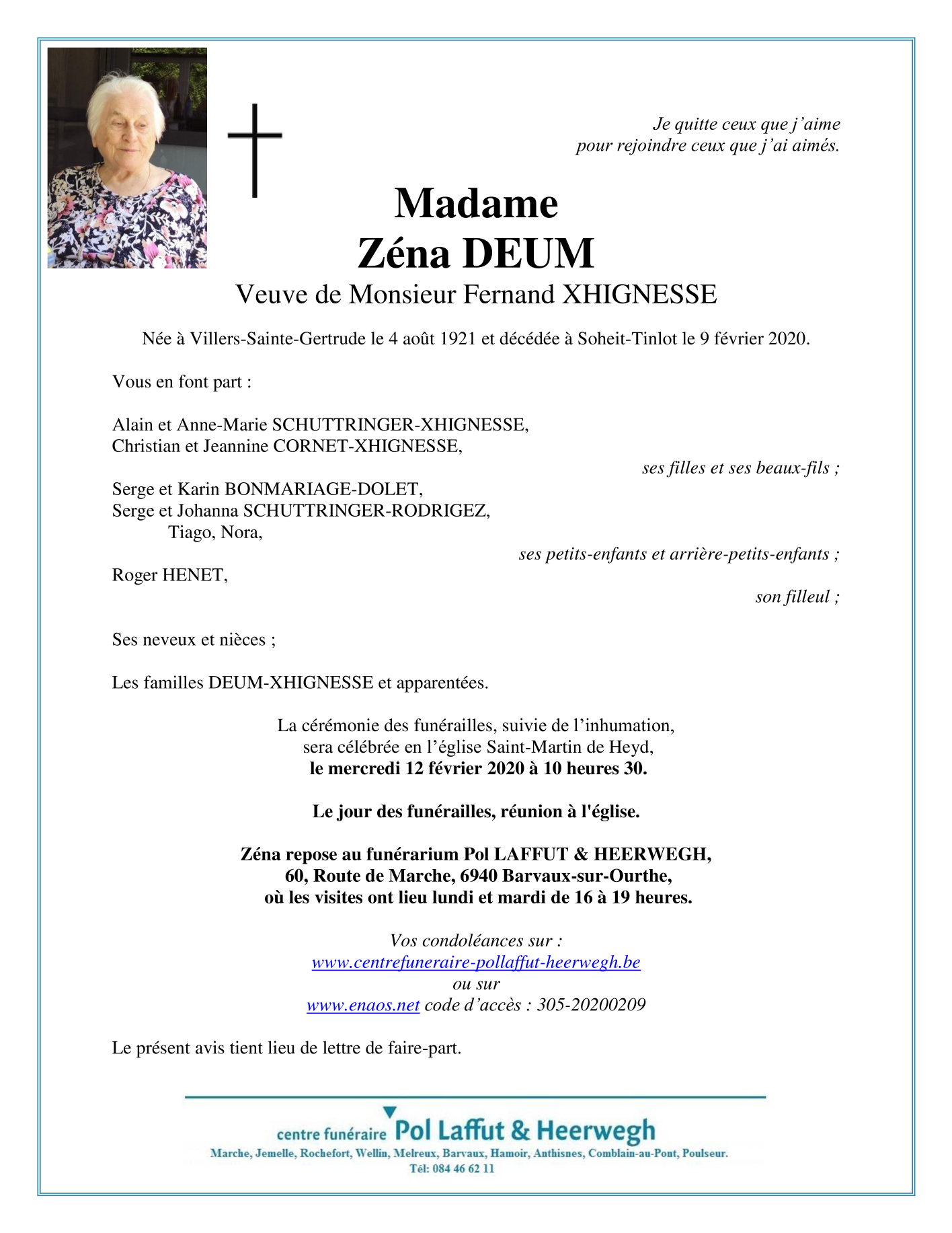 Overleden te Soheit-Tinlot (4557) op zondag 9 februari 2020 op 98-jarige leeftijd