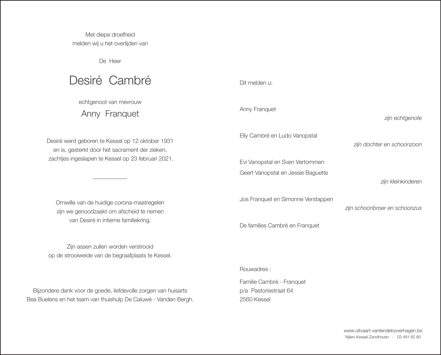 Décédé à Kessel (2560) le mardi 23 février 2021 à l'âge de 89 ans