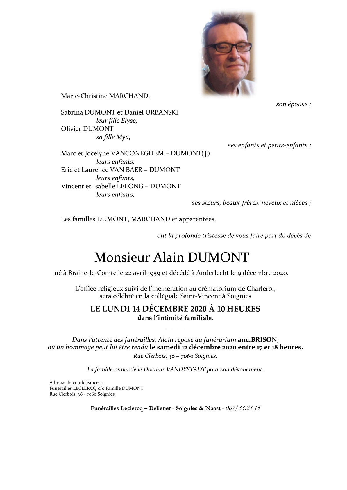 Décédé à Anderlecht (1070) le mercredi 9 décembre 2020 à l'âge de 61 ans