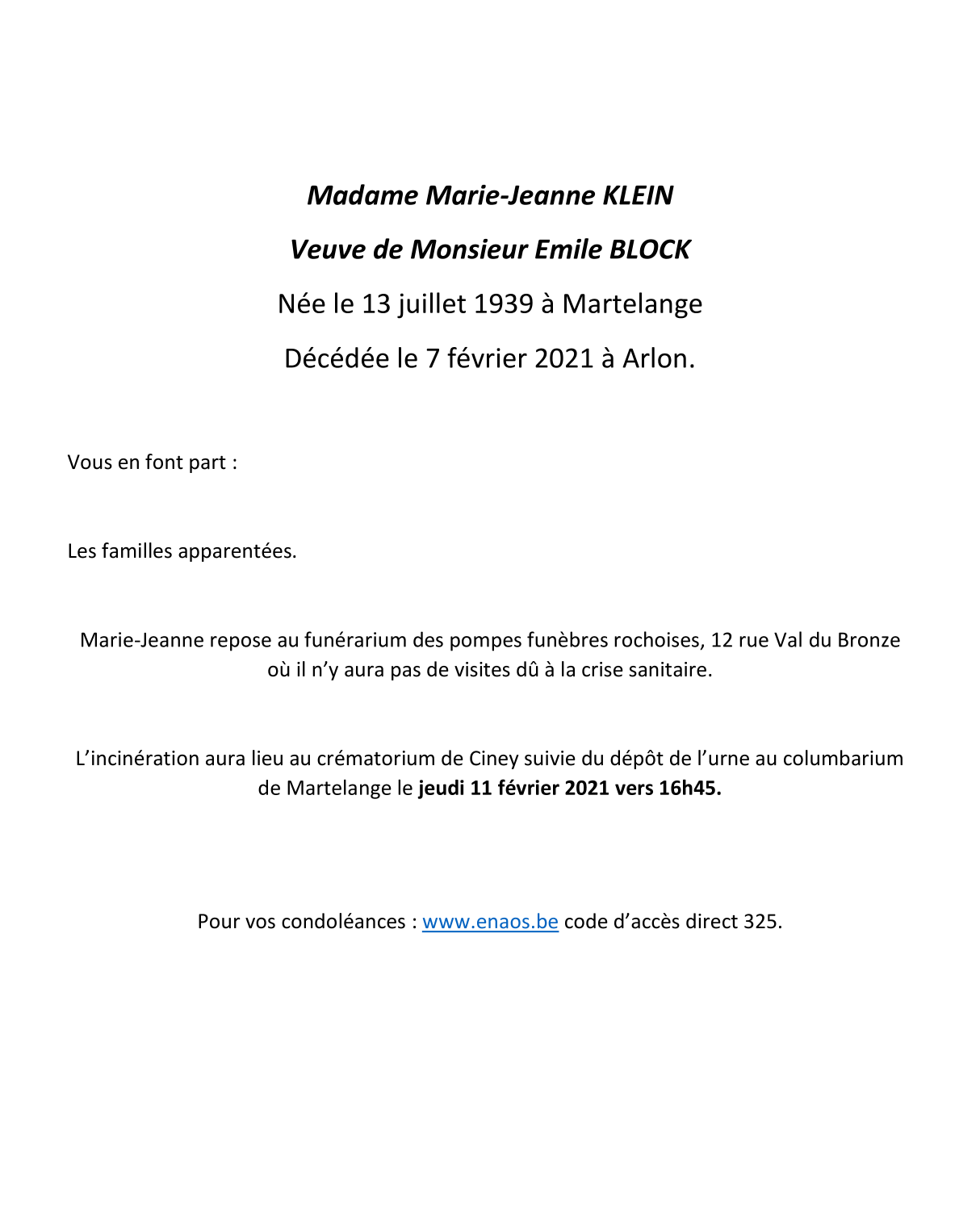 Décédée à Arlon (6700) le lundi 8 février 2021 à l'âge de 81 ans