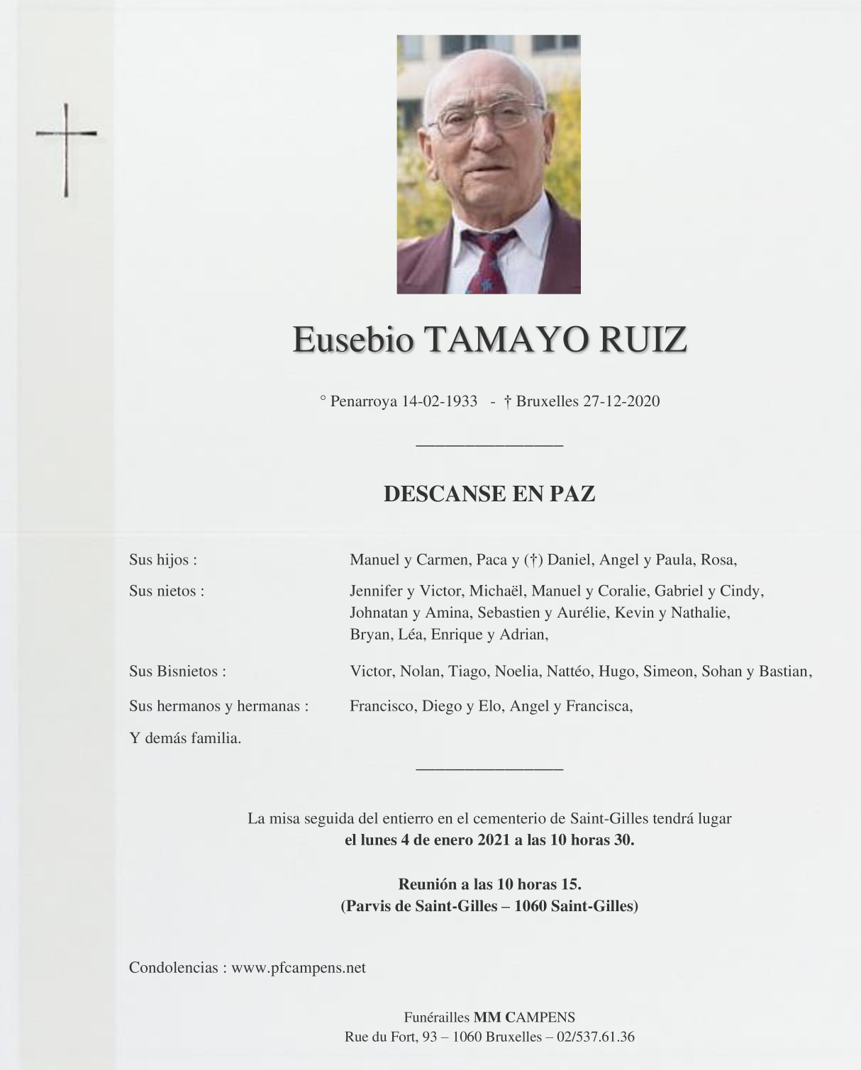 Décédé à Bruxelles (1000) le dimanche 27 décembre 2020 à l'âge de 87 ans