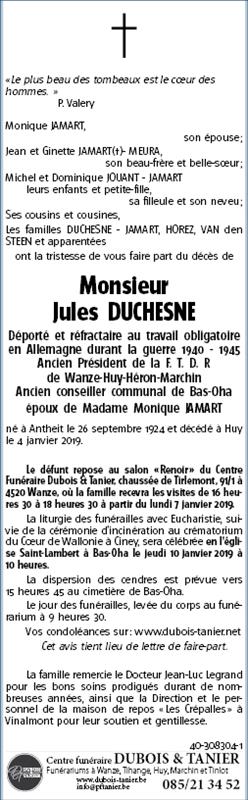 Décédé à Huy (4500) le vendredi 4 janvier 2019 à l'âge de 94 ans