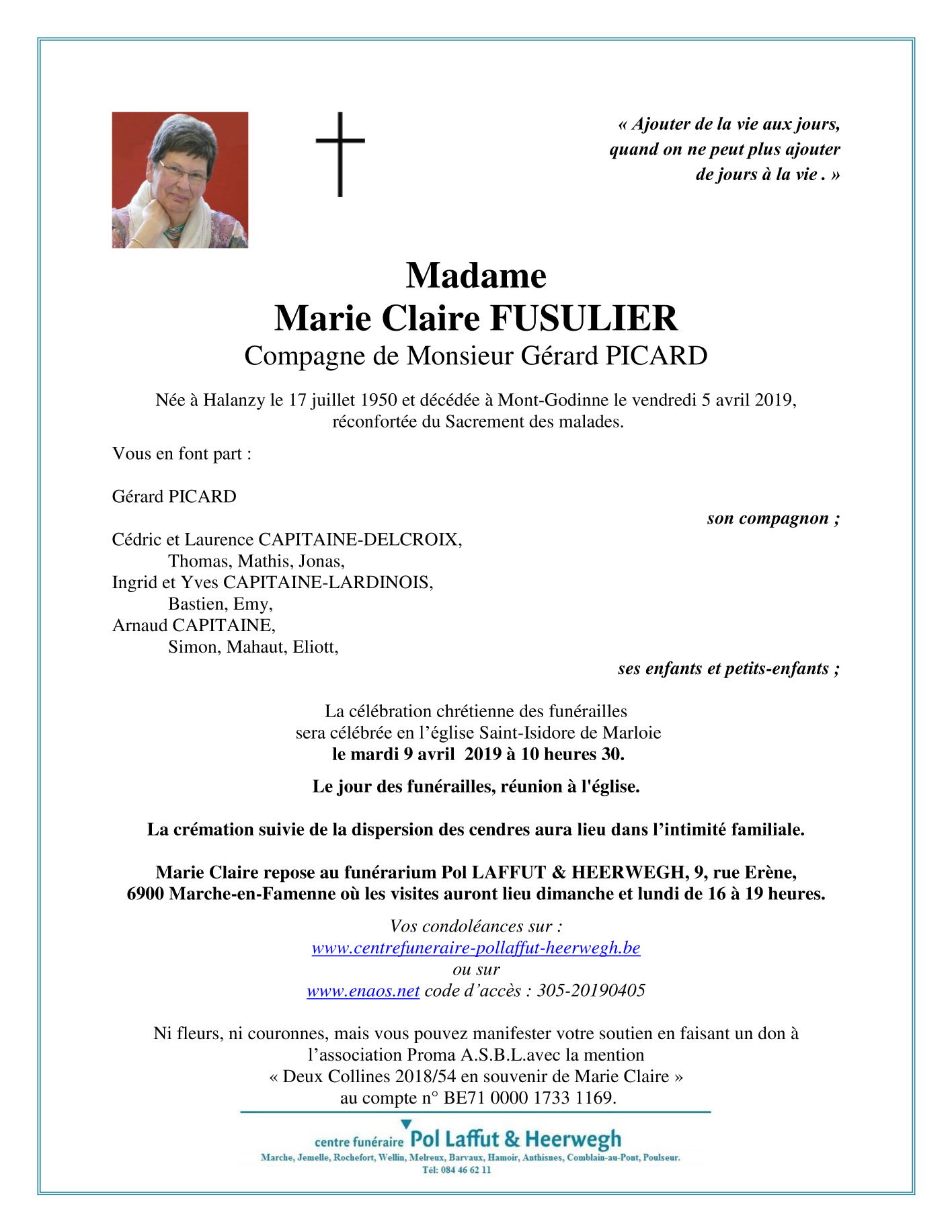 Décédée à Mont-Godinne (5530) le vendredi 5 avril 2019 à l'âge de 68 ans