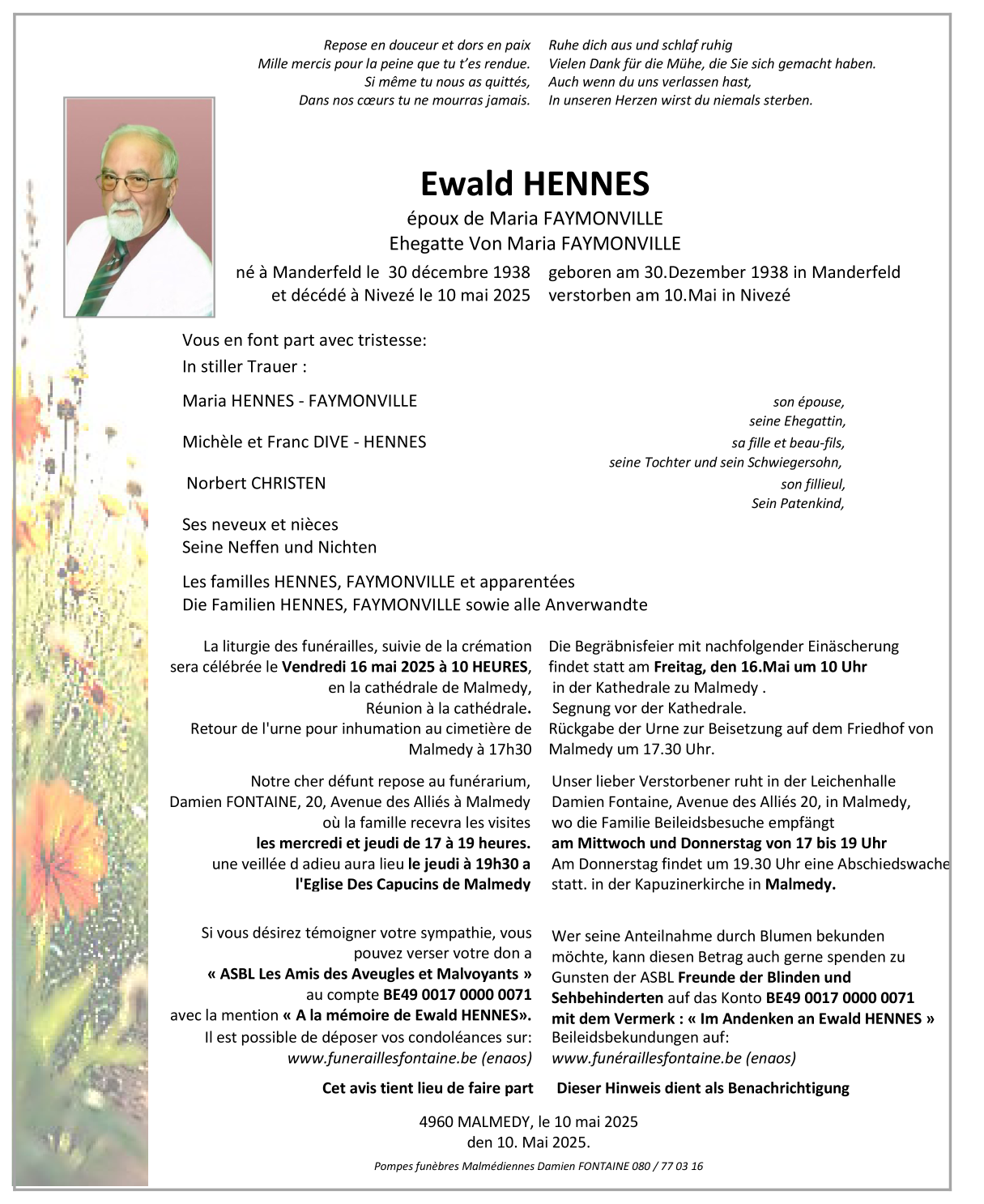 Décédé à Nivezé (4900) le samedi 10 mai 2025 à l'âge de 87 ans