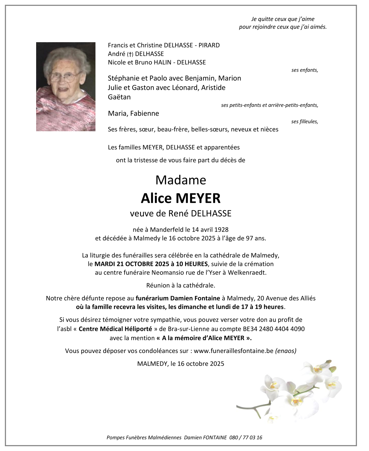 Fallecida en Malmedy (4960) el jueves, 16 de octubre de 2025 a la edad de 97 años