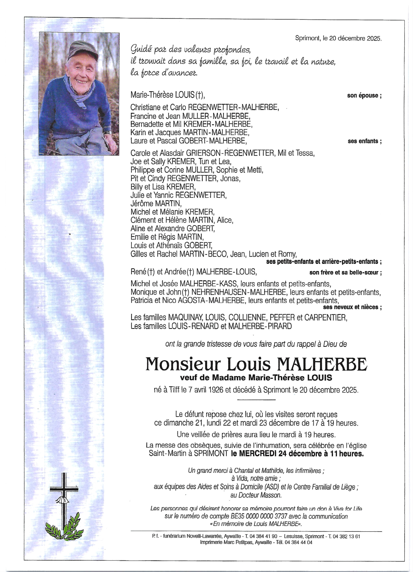 Décédé à Sprimont (4140) le samedi 20 décembre 2025 à l'âge de 99 ans
