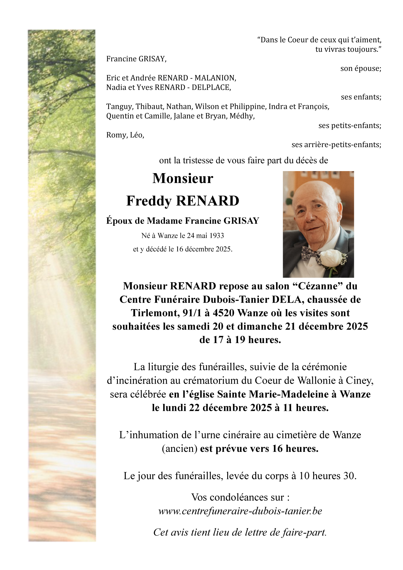 Décédé à Wanze (4520) le mardi 16 décembre 2025 à l'âge de 92 ans