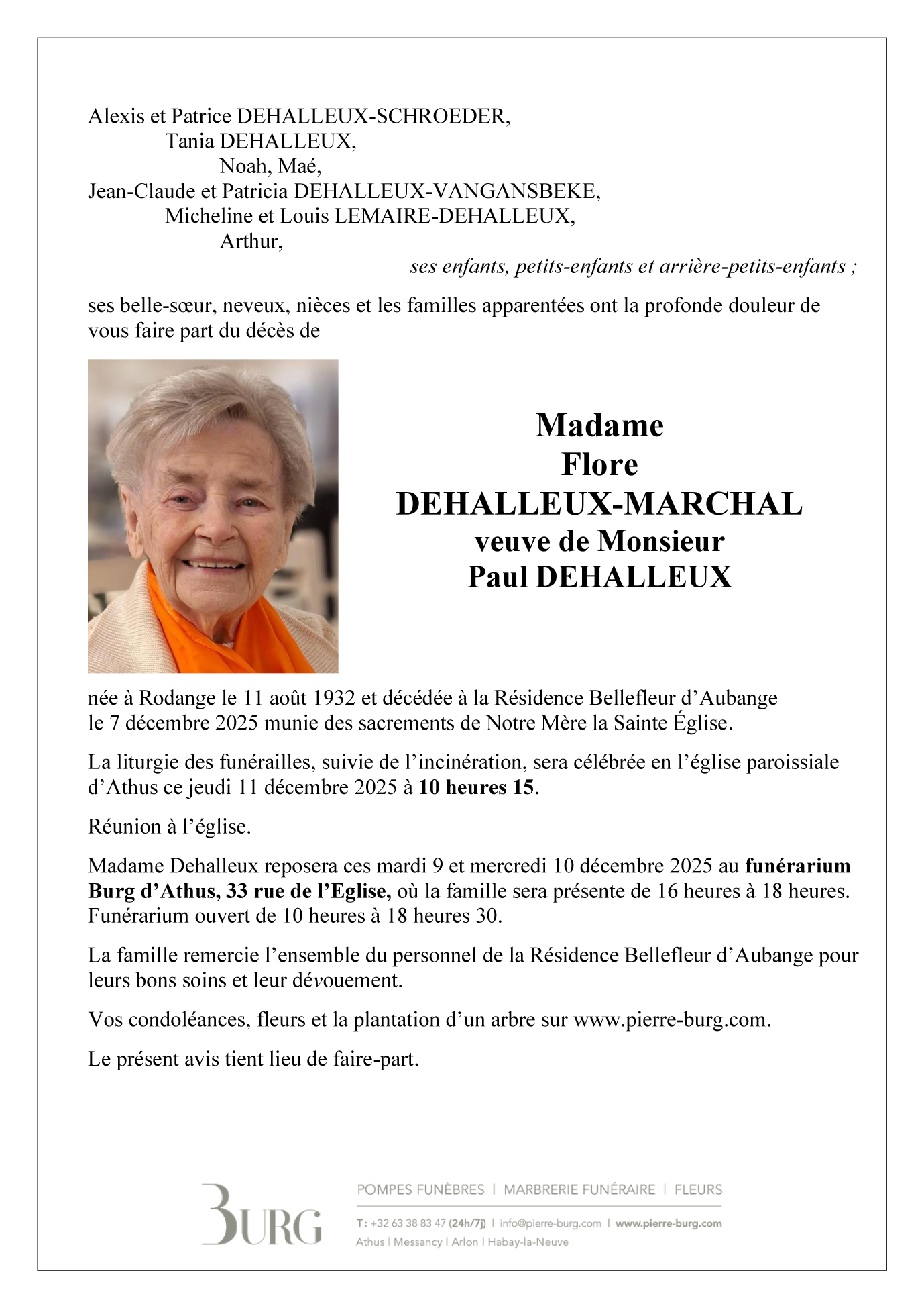 Décédée à Aubange (6790) le dimanche 7 décembre 2025 à l'âge de 93 ans