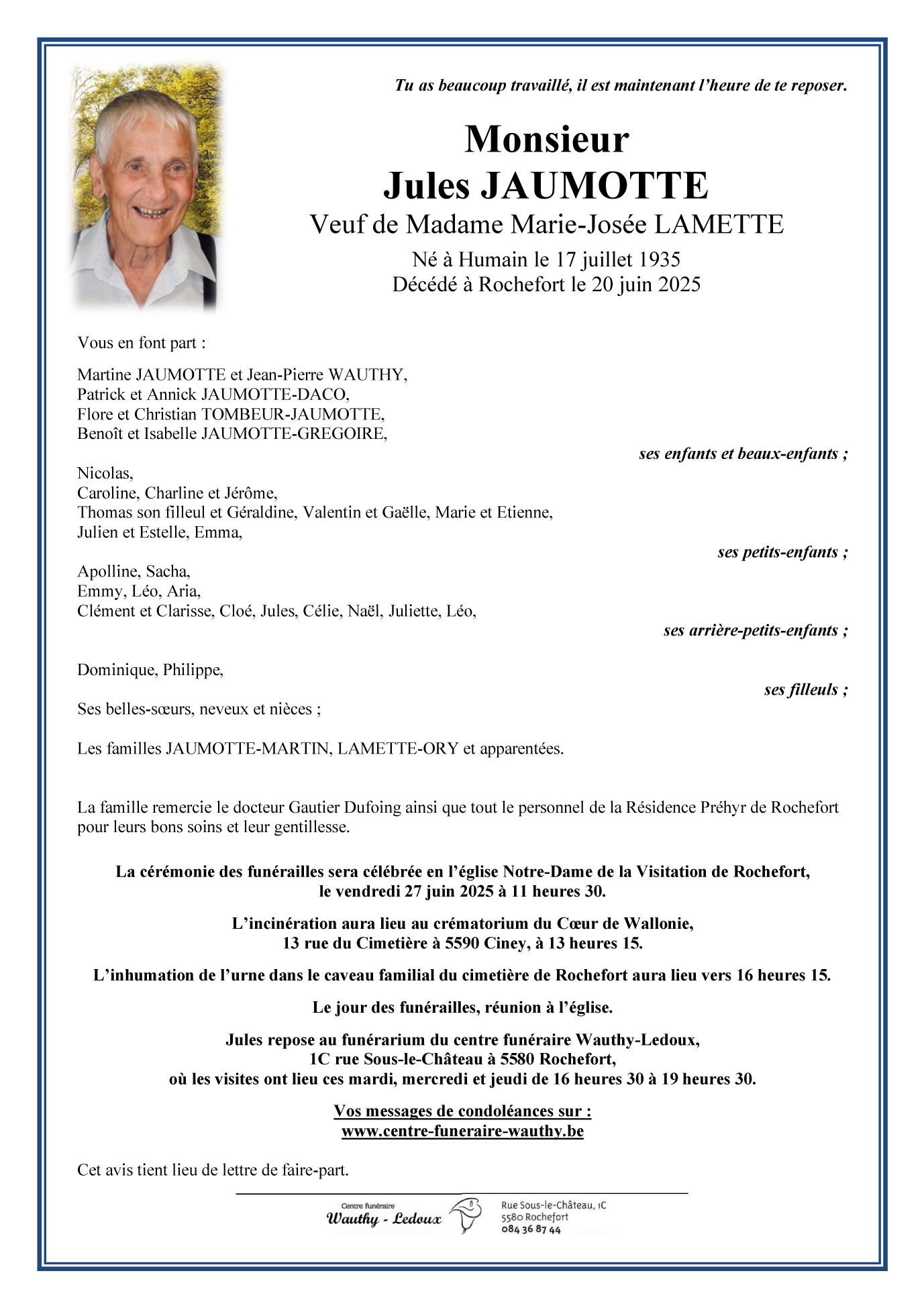 Décédé à Rochefort (5580) le vendredi 20 juin 2025 à l'âge de 89 ans
