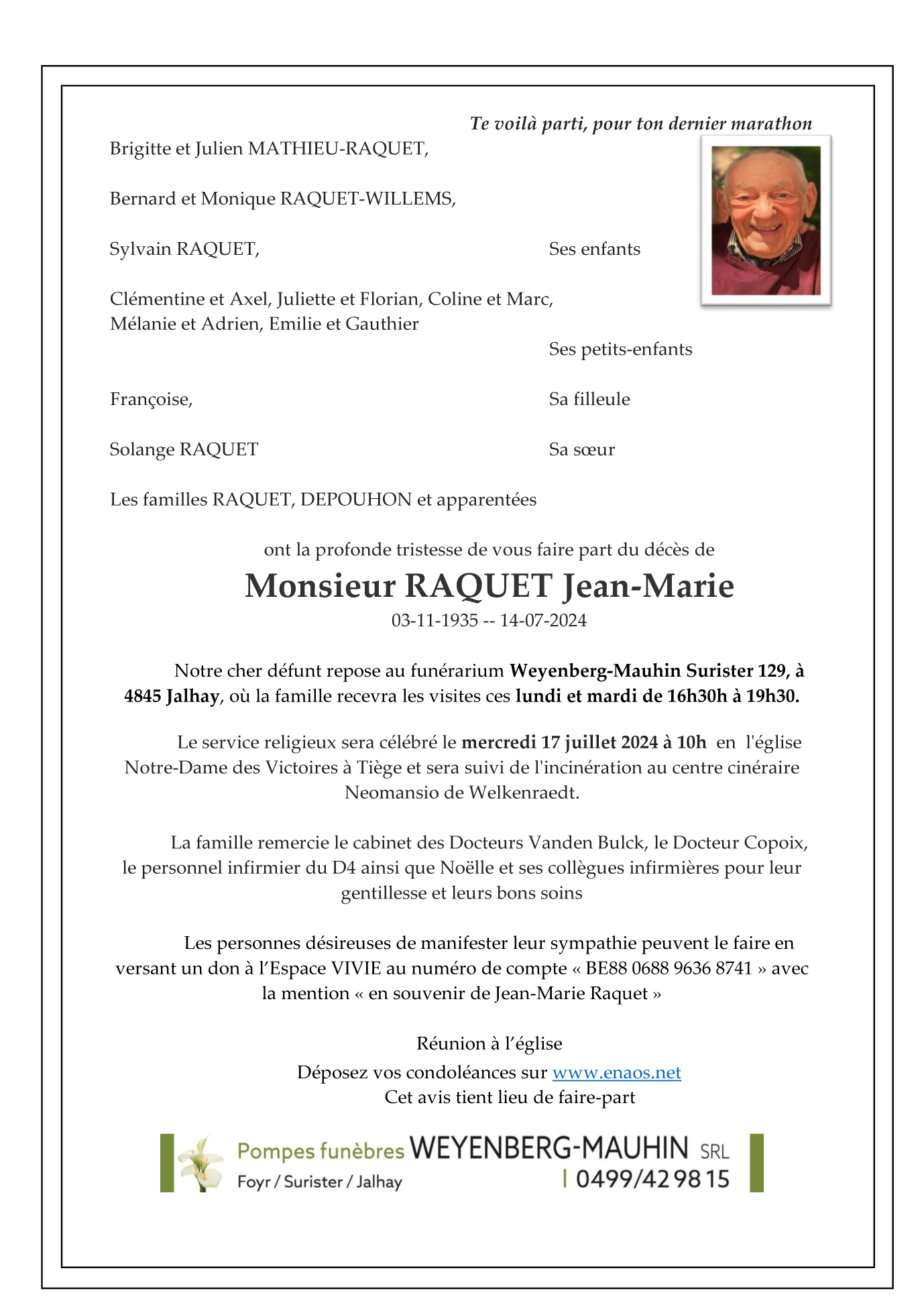 Fallecido en Tiège (4845) el domingo, 14 de julio de 2024 a la edad de 88 años
