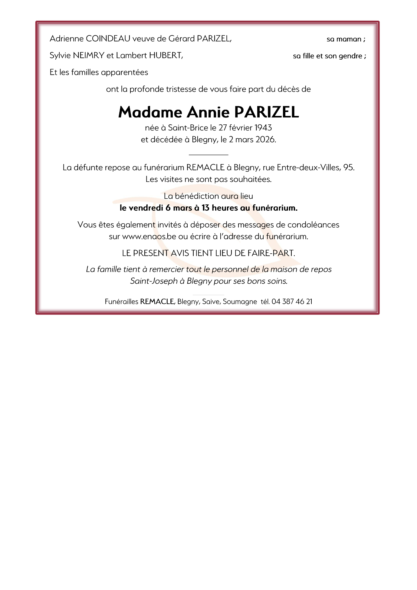 Décédée à Blegny (4670) le lundi 2 mars 2026 à l'âge de 83 ans