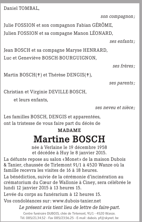 Fallecida en Huy (4500) el jueves, 8 de enero de 2015 a la edad de 56 años