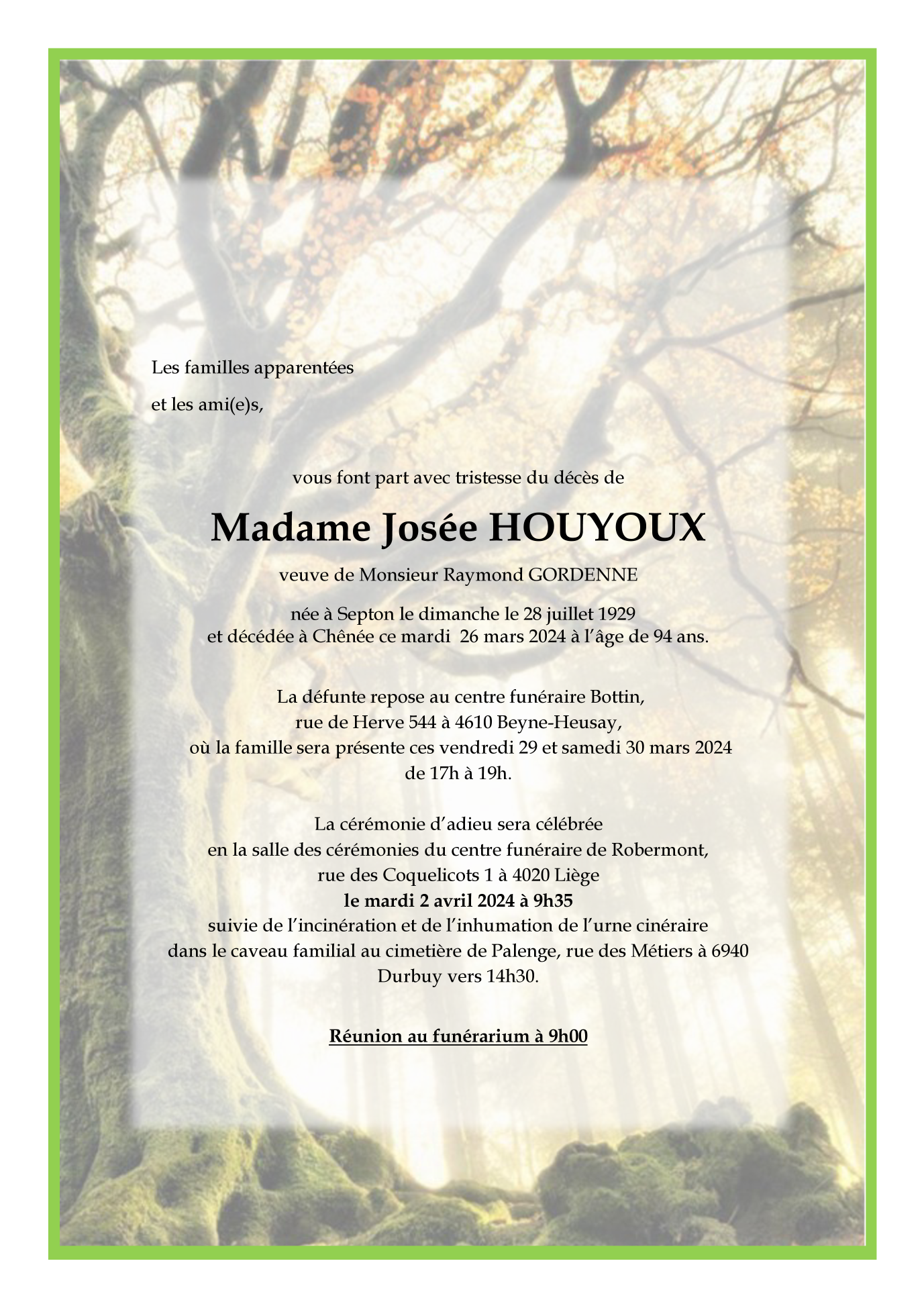 Fallecida en Chênée (4032) el martes, 26 de marzo de 2024 a la edad de 94 años
