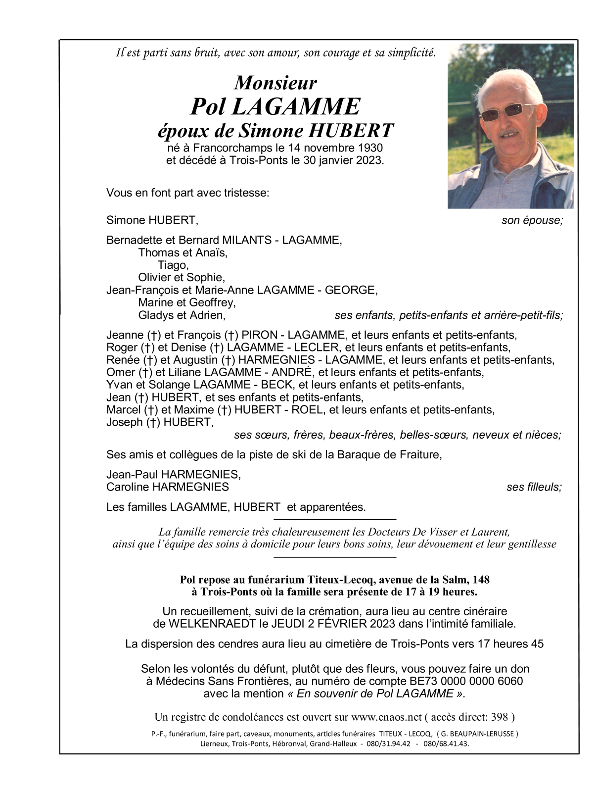 Décédé à Trois-Ponts (4980) le lundi 30 janvier 2023 à l'âge de 92 ans