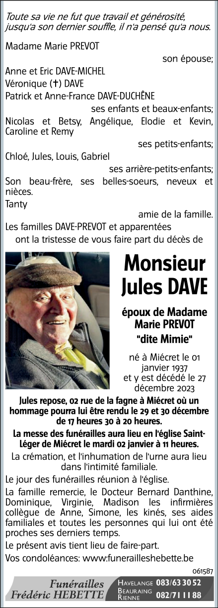 Décédé à Miécret (5376) le mercredi 27 décembre 2023 à l'âge de 86 ans