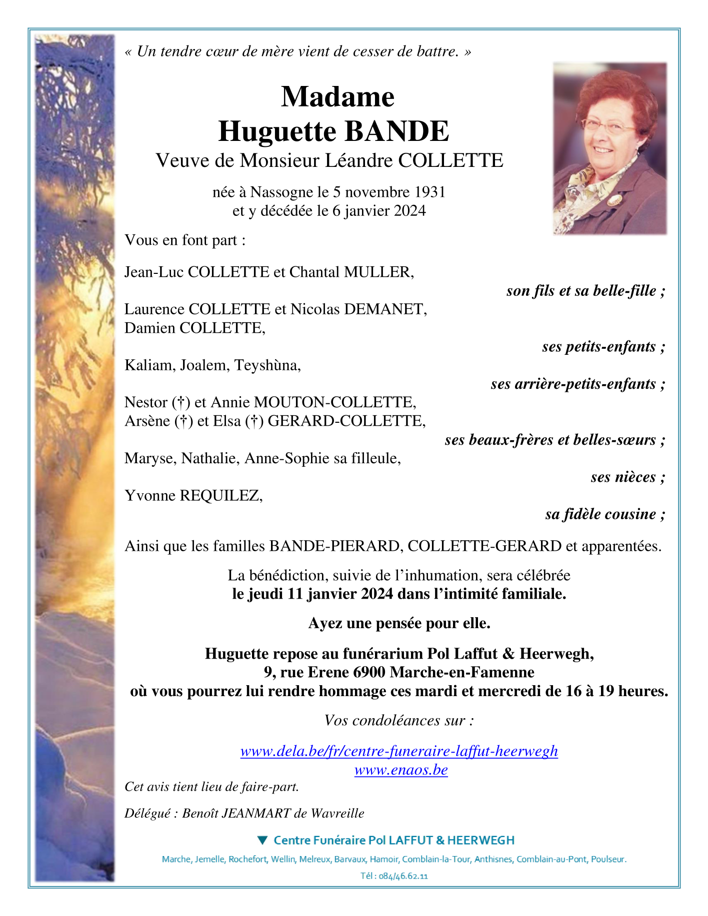 Overleden te Nassogne (6950) op zaterdag 6 januari 2024 op 92-jarige leeftijd
