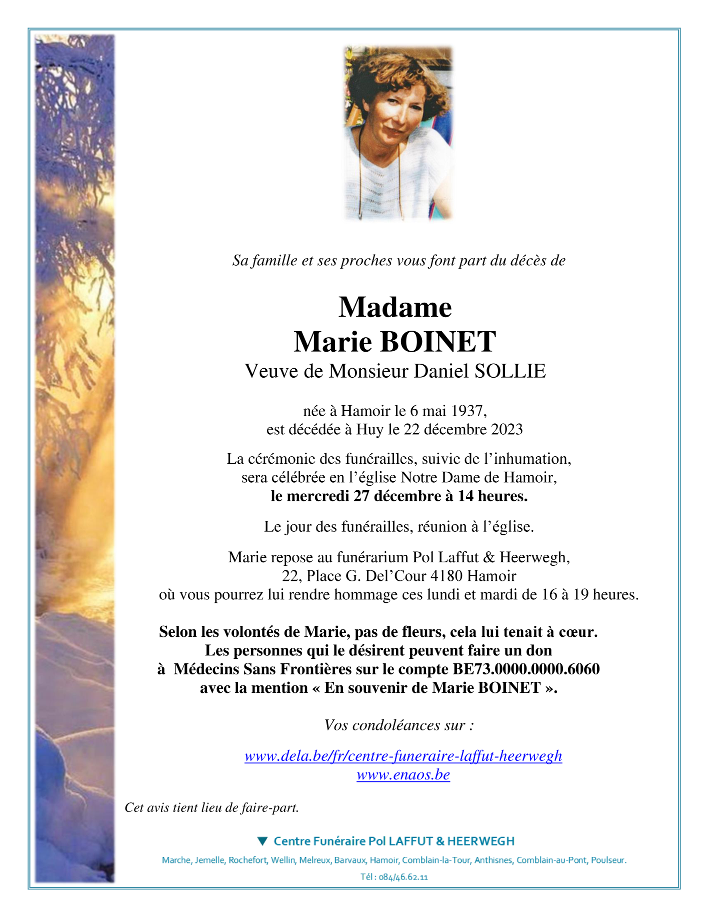 Décédée à Huy (4500) le vendredi 22 décembre 2023 à l'âge de 86 ans