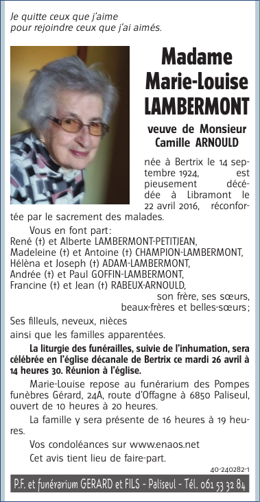 Décédée à Libramont (6800) le vendredi 22 avril 2016 à l'âge de 91 ans