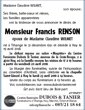 Overleden te Huy (4500) op donderdag 19 april 2018 op 66-jarige leeftijd