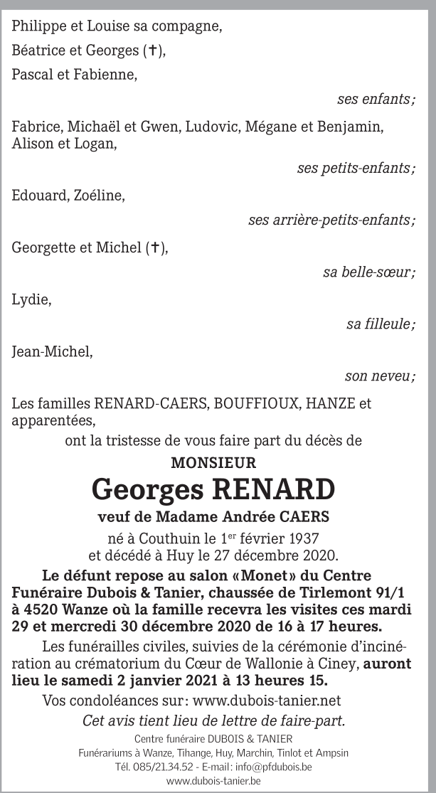 Décédé à Huy (4500) le dimanche 27 décembre 2020 à l'âge de 83 ans