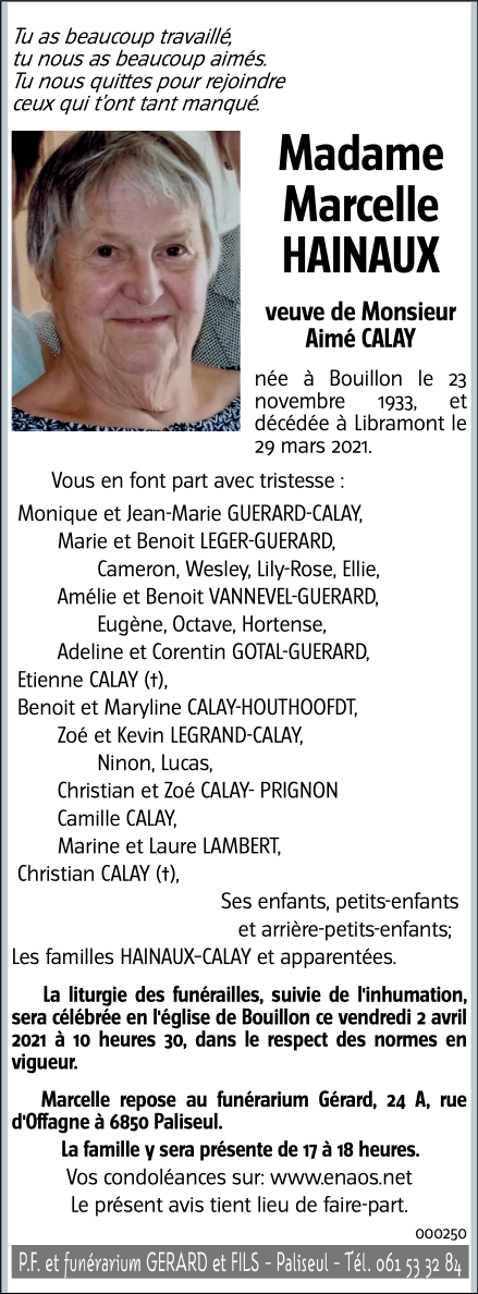 Décédée à Libramont (6800) le lundi 29 mars 2021 à l'âge de 87 ans