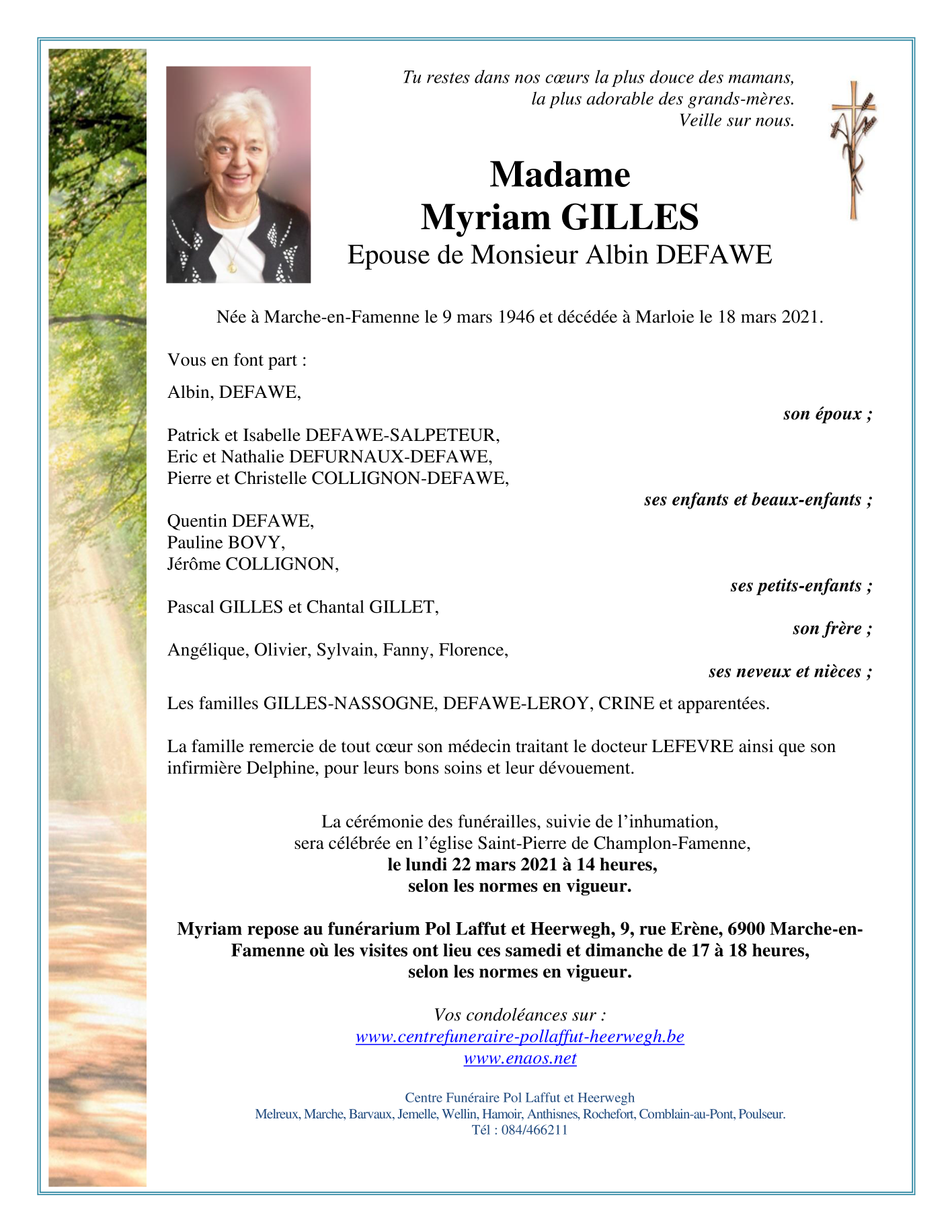 Décédée à Marloie (6900) le jeudi 18 mars 2021 à l'âge de 75 ans