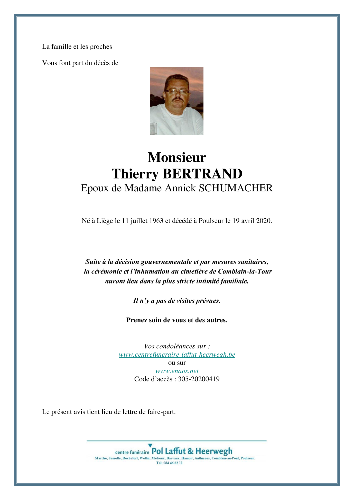 Died in Poulseur (4171) on 19 April 2020 at the age of 56 years