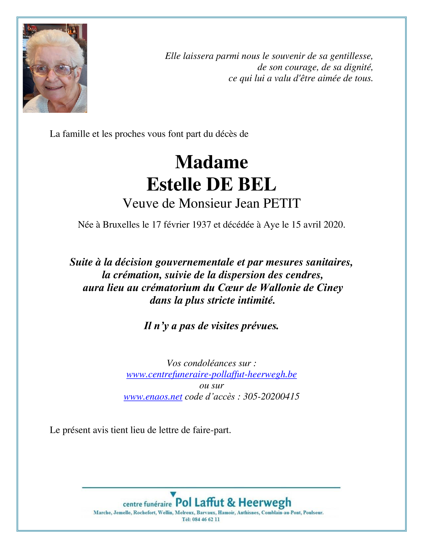 Décédée à Aye (6900) le mercredi 15 avril 2020 à l'âge de 83 ans