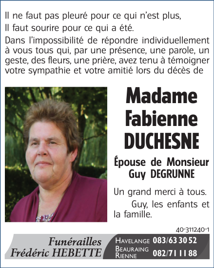 Décédée à Dinant (5500) le lundi 24 décembre 2018 à l'âge de 64 ans